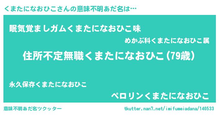 | 男性向けラノベタイトル風あだ名 | 『この素晴らしい世界にくまたになおひこを!』 |
