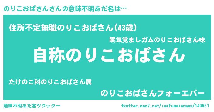 | 男性向けラノベタイトル風あだ名 | 『Re:のりこおばさんから始める異世界生活』 |