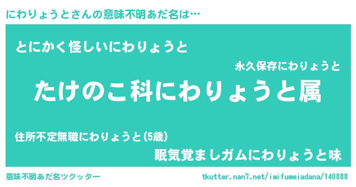 | 男性向けラノベタイトル風あだ名 | 『転生したらにわりょうとだった件』 |