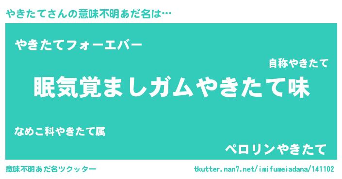 | 女子向けラノベタイトル風あだ名 | 『やきたて恋絵巻』『やきたて伯爵の花嫁』 |
