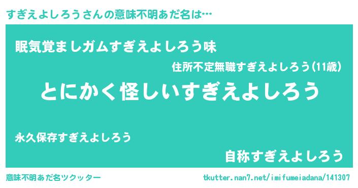 | 男性向けラノベタイトル風あだ名 | 『すぎえよしろうの嫁は女の子じゃないと思った?』 |