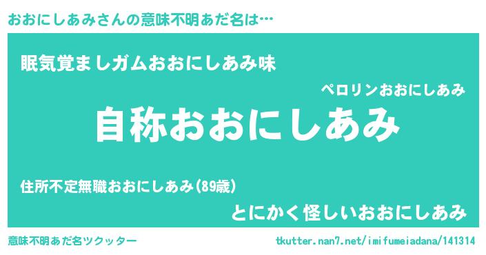 | 男性向けラノベタイトル風あだ名 | 『Re:おおにしあみから始める異世界生活』 |