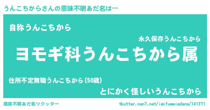 | 男性向けラノベタイトル風あだ名 | 『うんこちから~年齢イコール彼女いない歴の魔法使い~』 |