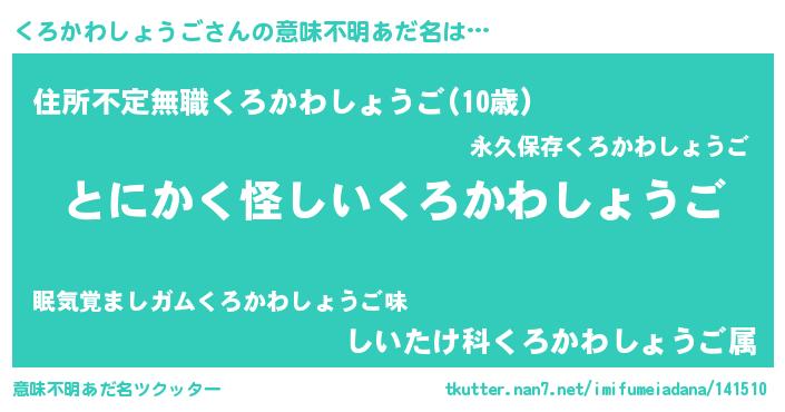 | 男性向けラノベタイトル風あだ名 | 『くろかわしょうごの嫁は女の子じゃないと思った?』 |