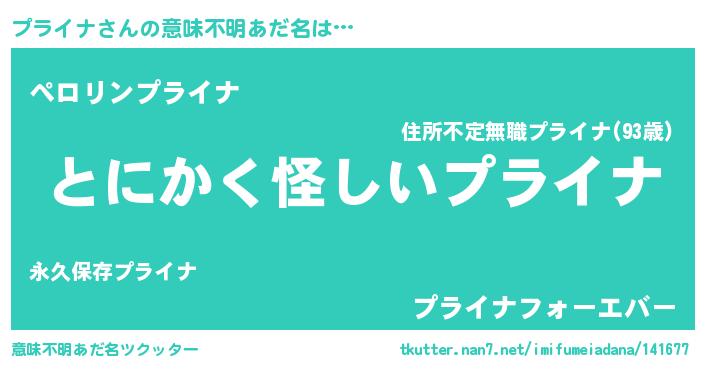 | 男性向けラノベタイトル風あだ名 | 『プライナの嫁は女の子じゃないと思った?』 |