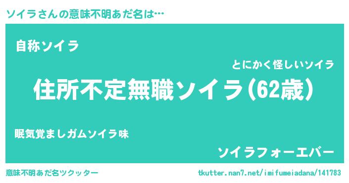 | 男性向けラノベタイトル風あだ名 | 『この素晴らしい世界にソイラを!』 |