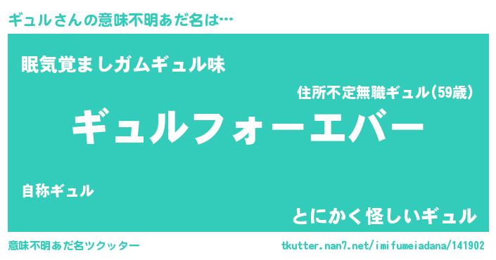 | 女子向けラノベタイトル風あだ名 | 『ギュルの雑貨屋さん』『ギュル恋絵巻』 |