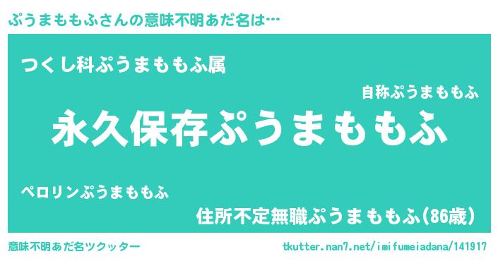| 男性向けラノベタイトル風あだ名 | 『ぷうまももふという概念が存在しない退屈な世界 』 |