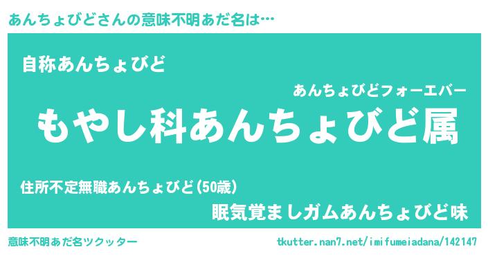 | 男性向けラノベタイトル風あだ名 | 『転生したらあんちょびどだった件』 |