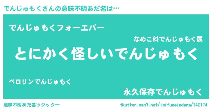 | 男性向けラノベタイトル風あだ名 | 『でんじゅもくの嫁は女の子じゃないと思った?』 |