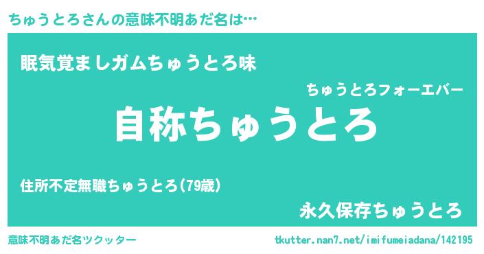 | 男性向けラノベタイトル風あだ名 | 『Re:ちゅうとろから始める異世界生活』 |