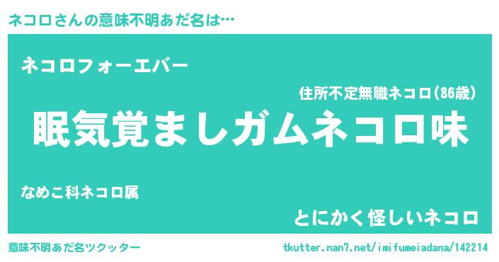 | 女子向けラノベタイトル風あだ名 | 『ネコロ恋絵巻』『ネコロの雑貨屋さん』 |