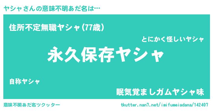 | 男性向けラノベタイトル風あだ名 | 『ヤシャという概念が存在しない退屈な世界 』 |