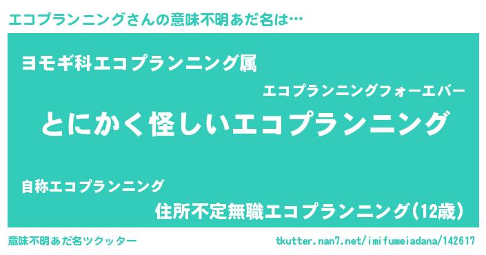 | 女子向けラノベタイトル風あだ名 | 『エコプランニングの卵を拾いまして』 |