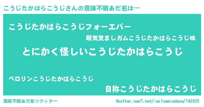 | 男性向けラノベタイトル風あだ名 | 『こうじたかはらこうじの嫁は女の子じゃないと思った?』 |