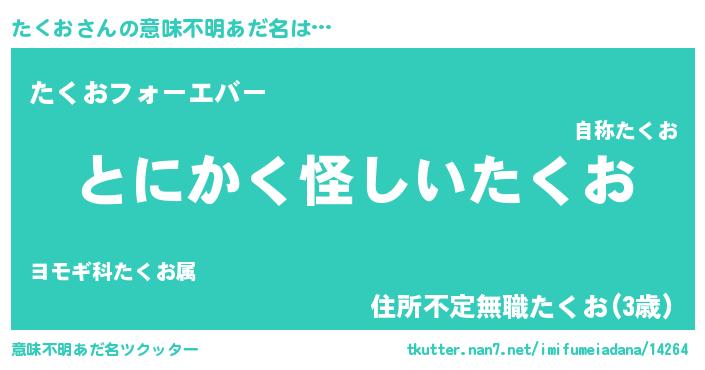 | 男性向けラノベタイトル風あだ名 | 『たくおの嫁は女の子じゃないと思った?』 |