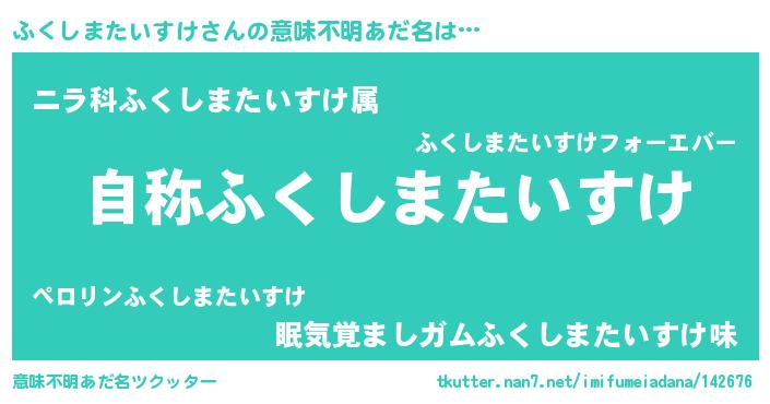 | 男性向けラノベタイトル風あだ名 | 『Re:ふくしまたいすけから始める異世界生活』 |