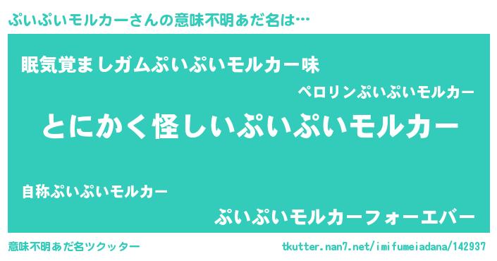 | 男性向けラノベタイトル風あだ名 | 『ぷいぷいモルカーの嫁は女の子じゃないと思った?』 |
