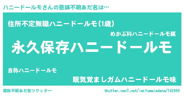 | 胡散臭い通販商品みたいなあだ名 | 『絶対に幸福をもたらす水素水…その名も「ハニードールモ」』 |