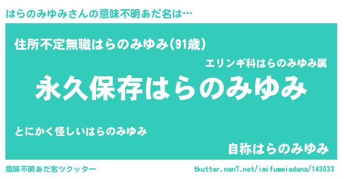 | ヘコむあだ名 | 『はらのみゆみ(遠い目)』『はらぷりん』 |