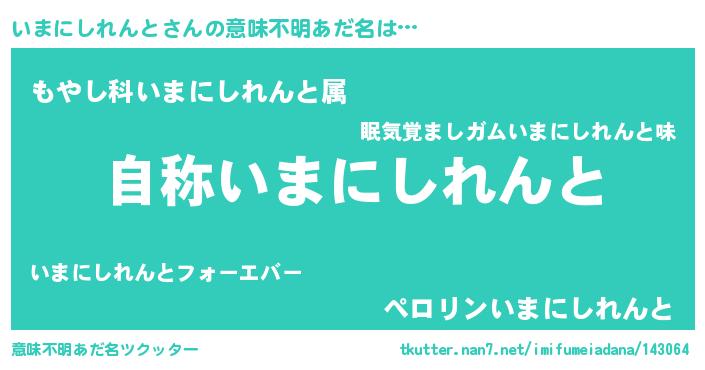 | 男性向けラノベタイトル風あだ名 | 『Re:いまにしれんとから始める異世界生活』 |