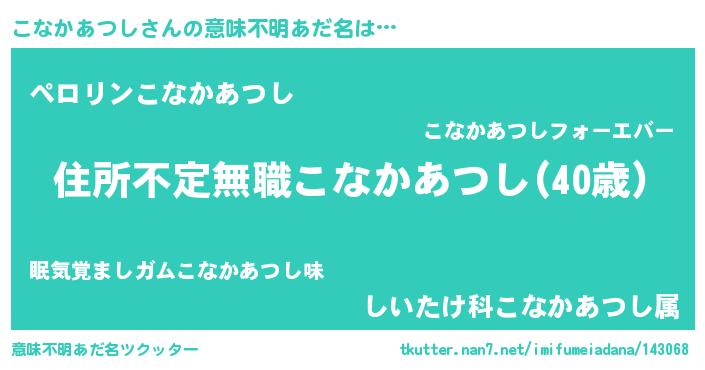 | 女子向けラノベタイトル風あだ名 | 『こなかあつしが死なない童話 林檎のこなかあつしの診療簿』 |