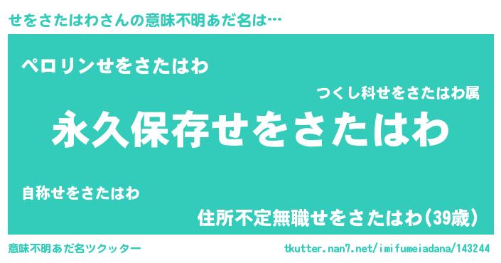 | 男性向けラノベタイトル風あだ名 | 『せをさたはわという概念が存在しない退屈な世界 』 |