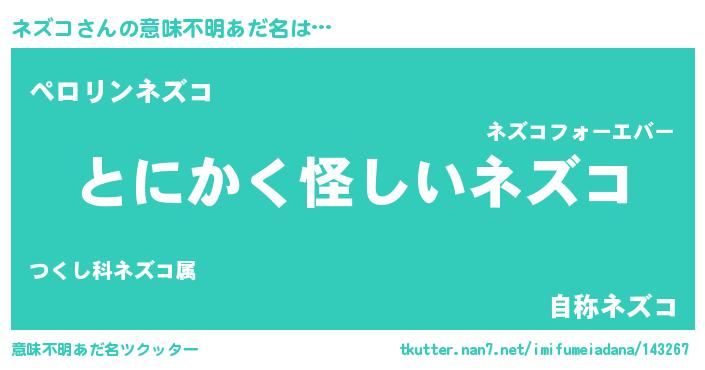 | 男性向けラノベタイトル風あだ名 | 『ダンジョンにネズコを求めるのは間違っているだろうか』 |
