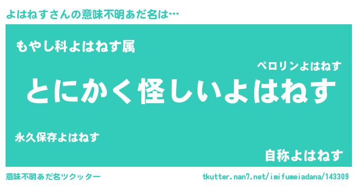 | 男性向けラノベタイトル風あだ名 | 『よはねすの嫁は女の子じゃないと思った?』 |