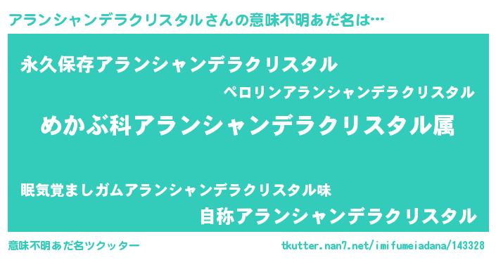 | 男性向けラノベタイトル風あだ名 | 『アランシャンデラクリスタルスレイヤー』 |