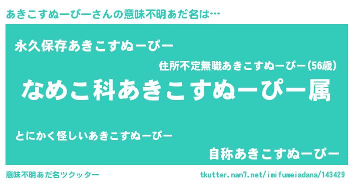 | 男性向けラノベタイトル風あだ名 | 『転生したらあきこすぬーぴーだった件』 |