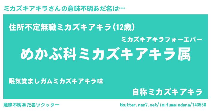 | 男性向けラノベタイトル風あだ名 | 『ミカズキアキラスレイヤー』 |