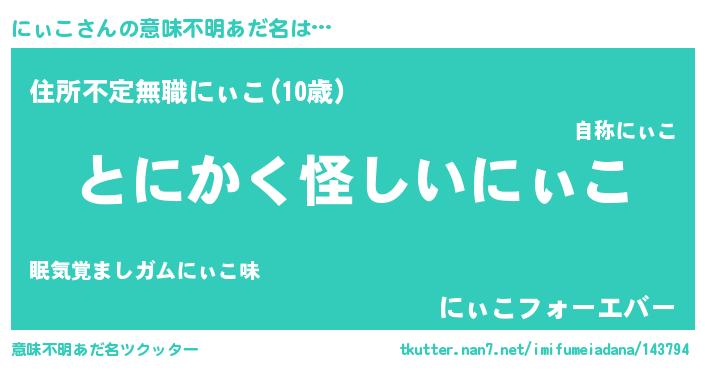| 男性向けラノベタイトル風あだ名 | 『にぃこの嫁は女の子じゃないと思った?』 |