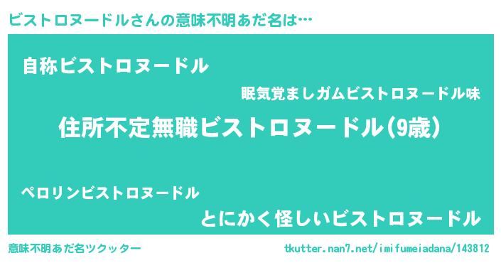 | 女子向けラノベタイトル風あだ名 | 『悪役ビストロヌードルに転生したようですが、知った事ではありません』 |