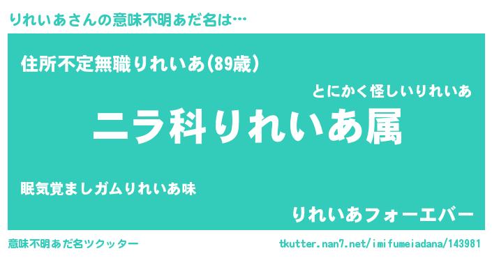 | 男性向けラノベタイトル風あだ名 | 『りれいあ~年齢イコール彼女いない歴の魔法使い~』 |