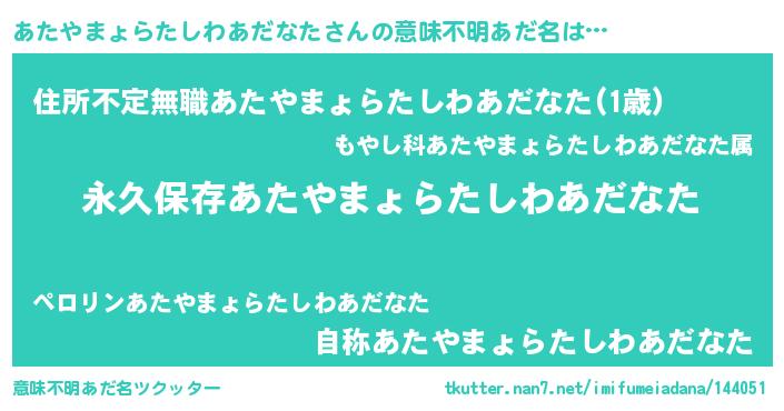 | ヘコむあだ名 | 『あたやまょらたしわあだなた(遠い目)』 |