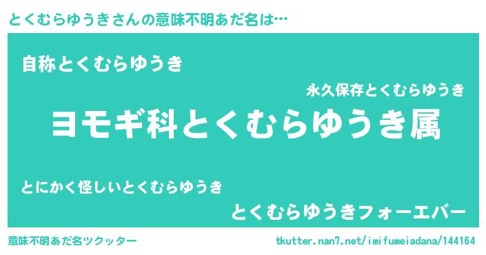 | 男性向けラノベタイトル風あだ名 | 『とくむらゆうき~年齢イコール彼女いない歴の魔法使い~』 |