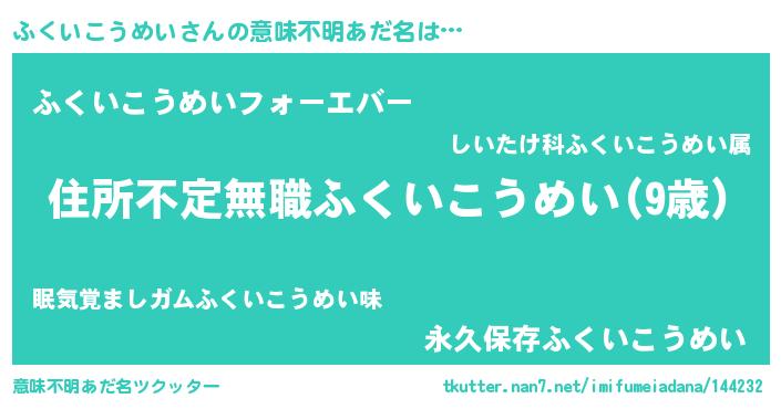| 男性向けラノベタイトル風あだ名 | 『この素晴らしい世界にふくいこうめいを!』 |