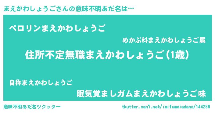 | 女子向けラノベタイトル風あだ名 | 『まえかわしょうごが死なない童話 林檎のまえかわしょうごの診療簿』 |