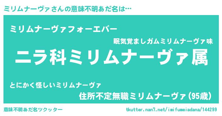 | 男性向けラノベタイトル風あだ名 | 『ミリムナーヴァ~年齢イコール彼女いない歴の魔法使い~』 |