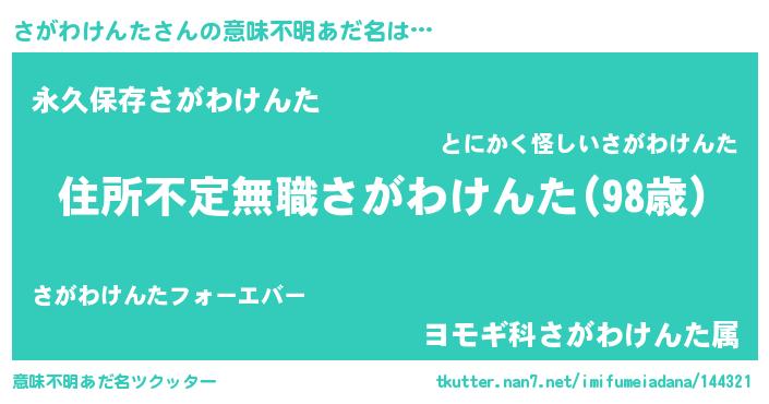 | 女子向けラノベタイトル風あだ名 | 『さがわけんたが死なない童話 林檎のさがわけんたの診療簿』 |