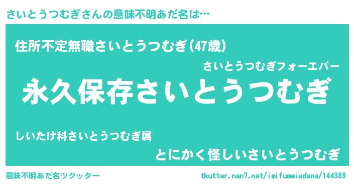 | 胡散臭い通販商品みたいなあだ名 | 『来世でも幸せになれる健康食品…その名も「さいとうつむぎ」』 |