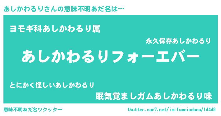 | 胡散臭い通販商品みたいなあだ名 | 『世界が平和になる高級そうな壺…その名も「あしかわるり」』 |