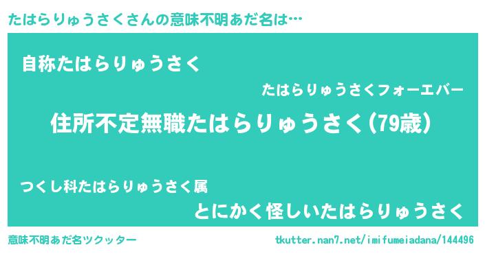 | 男性向けラノベタイトル風あだ名 | 『魔弾の王とたはらりゅうさく』 |