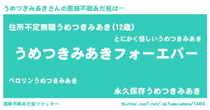| 男性向けラノベタイトル風あだ名 | 『うちのうめつきみあきが世界を掌握している!』 |