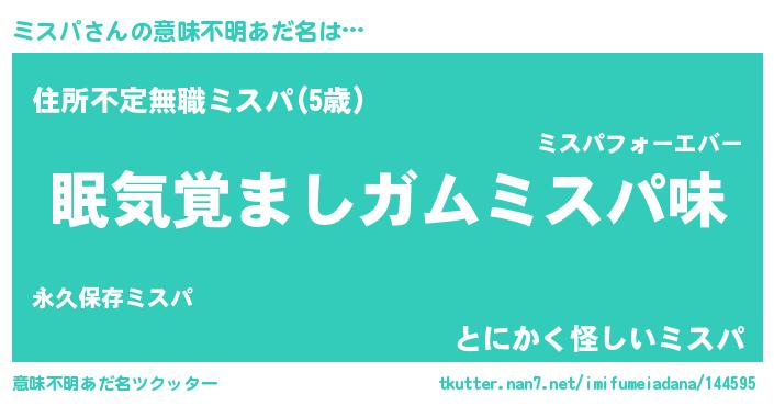 | 男性向けラノベタイトル風あだ名 | 『おまえをオタクにしてやるから、俺をミスパにしてくれ! 』 |