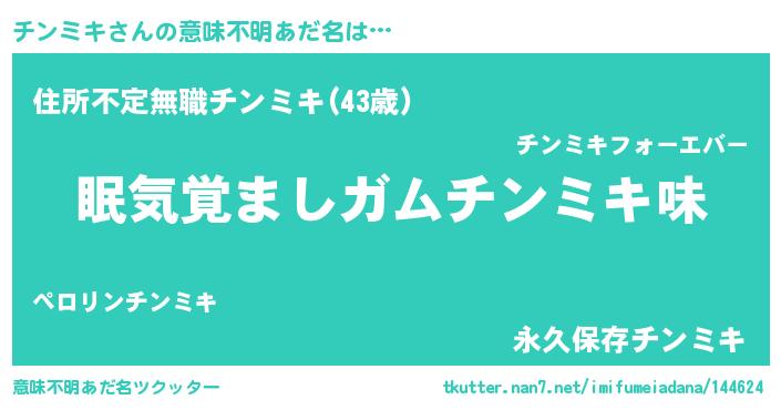 | 男性向けラノベタイトル風あだ名 | 『おまえをオタクにしてやるから、俺をチンミキにしてくれ! 』 |