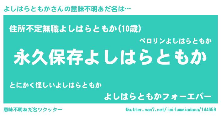 | 男性向けラノベタイトル風あだ名 | 『うちのよしはらともかが世界を掌握している!』 |