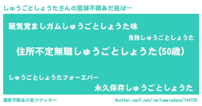 | 男性向けラノベタイトル風あだ名 | 『この素晴らしい世界にしゅうごとしょうたを!』 |