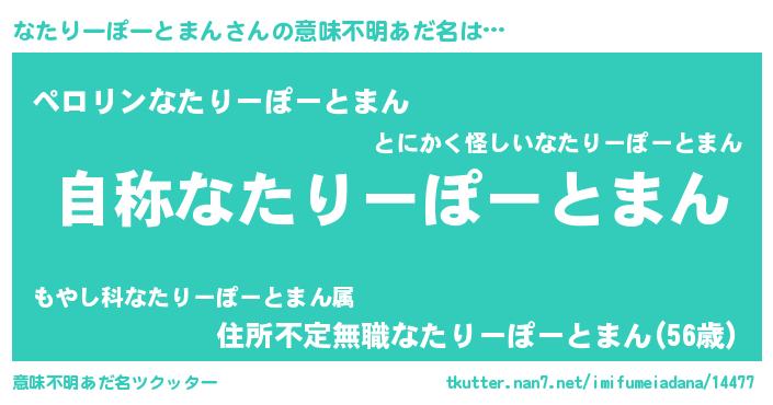 | 男性向けラノベタイトル風あだ名 | 『Re:なたりーぽーとまんから始める異世界生活』 |